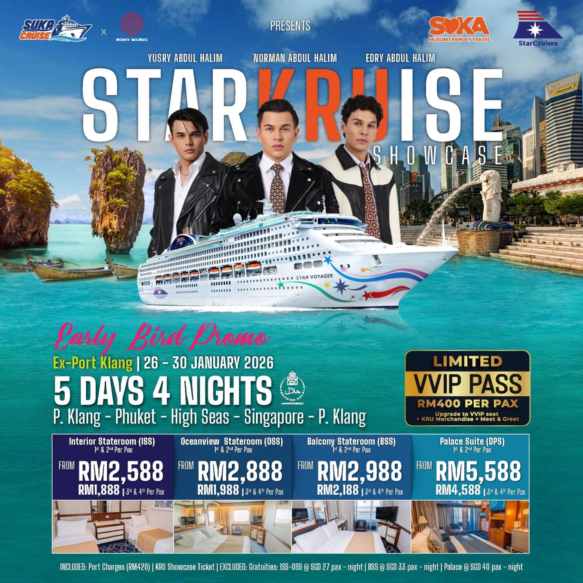 Embark on an unforgettable journey with SUKA Cruise, where every voyage is designed with comfort, entertainment, and Muslim-friendly hospitality in mind. Enjoy Halal-certified dining, vibrant onboard activities, and exclusive experiences such as the Star KRUise Showcase all aboard the luxurious Star Voyager Cruise. Discover the joy of cruising the SUKA way Fun, Halal & Memorable!