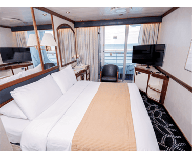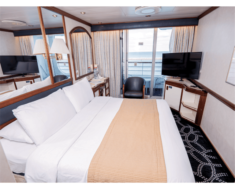 Room Setup: Spacious cabin with private balcony, floor-to-ceiling glass doors, sitting area, and ensuite bathroom. Available in twin or double configurations.