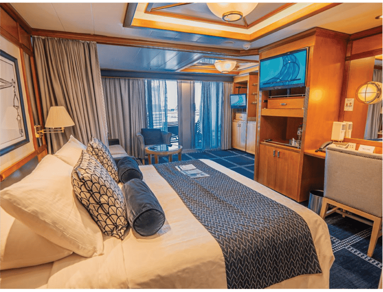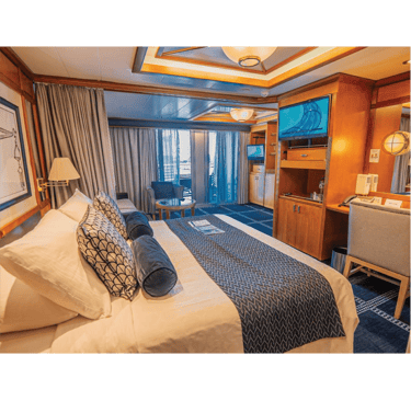 Room Setup: Features a large window or porthole offering ocean views, twin or double beds, private bathroom, and sitting area.